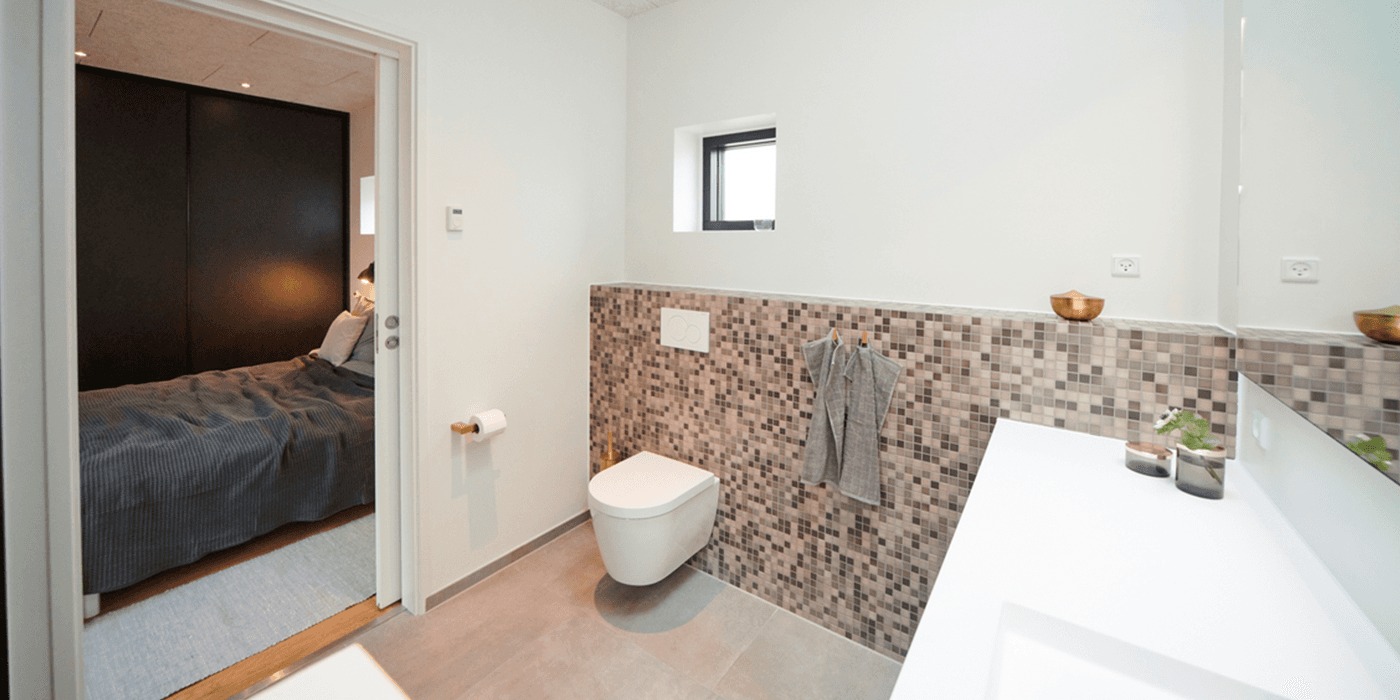 Badeværelset skal gerne være nemt tilgængeligt om natten, og om dagen er det praktisk, at det er centralt placeret i huset, uden at det har direkte adgang fra stue eller køkken-alrum. Du skal vurdere, om du ønsker et privat badeværelse i forbindelse med soveværelset og et andet badeværelse til gæster og resten af familien.