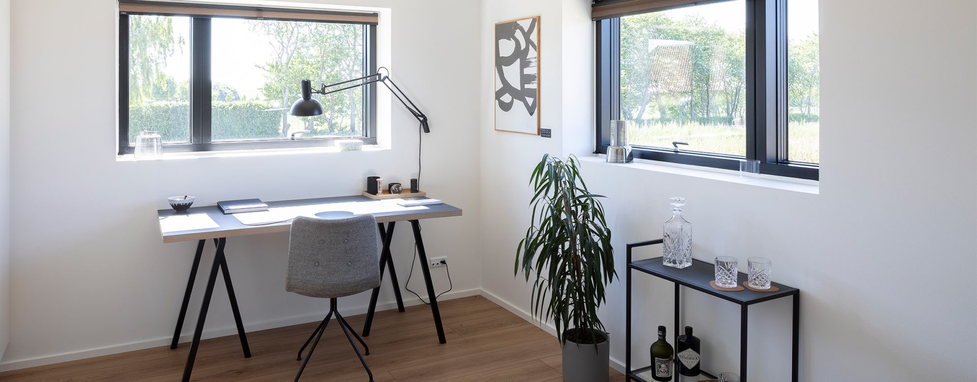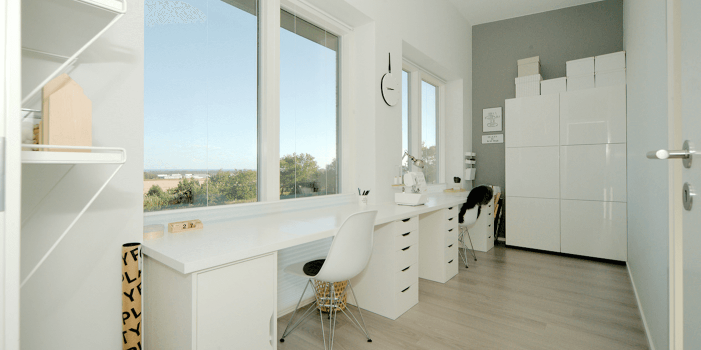 Et hjemmekontor skal indrettes efter dine behov – om det skal ligge i forbindelse med stuen, væk fra børneværelserne eller i åben forbindelse med køkken-alrummet er op til dig. Det skal være nemt at holde ryddeligt og der skal være stikkontakter nok til computere, skærme, printere med videre.