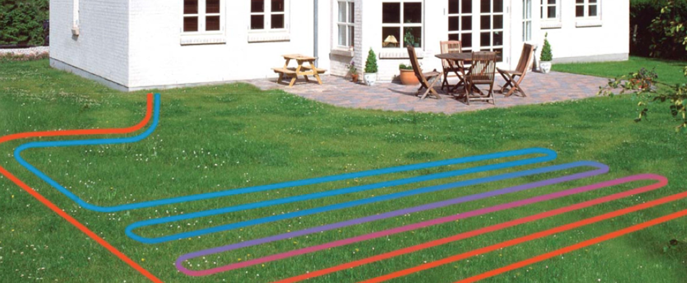 Et jordvarmeanlæg består groft sagt af en varmepumpe og en jordslange. Slangen graves ned i din græsplæne, hvor jo større areal slangen dækker, desto mere varme kan der genereres fra jorden.