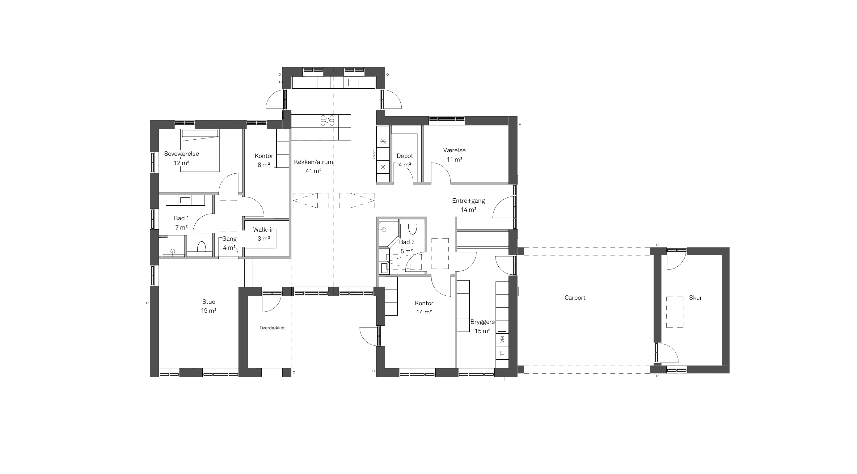 Fra stuen er voksenafdelingen placeret med en god fordeling mellem soveværelse, badeværelse, walk-in og et ekstra kontor.
