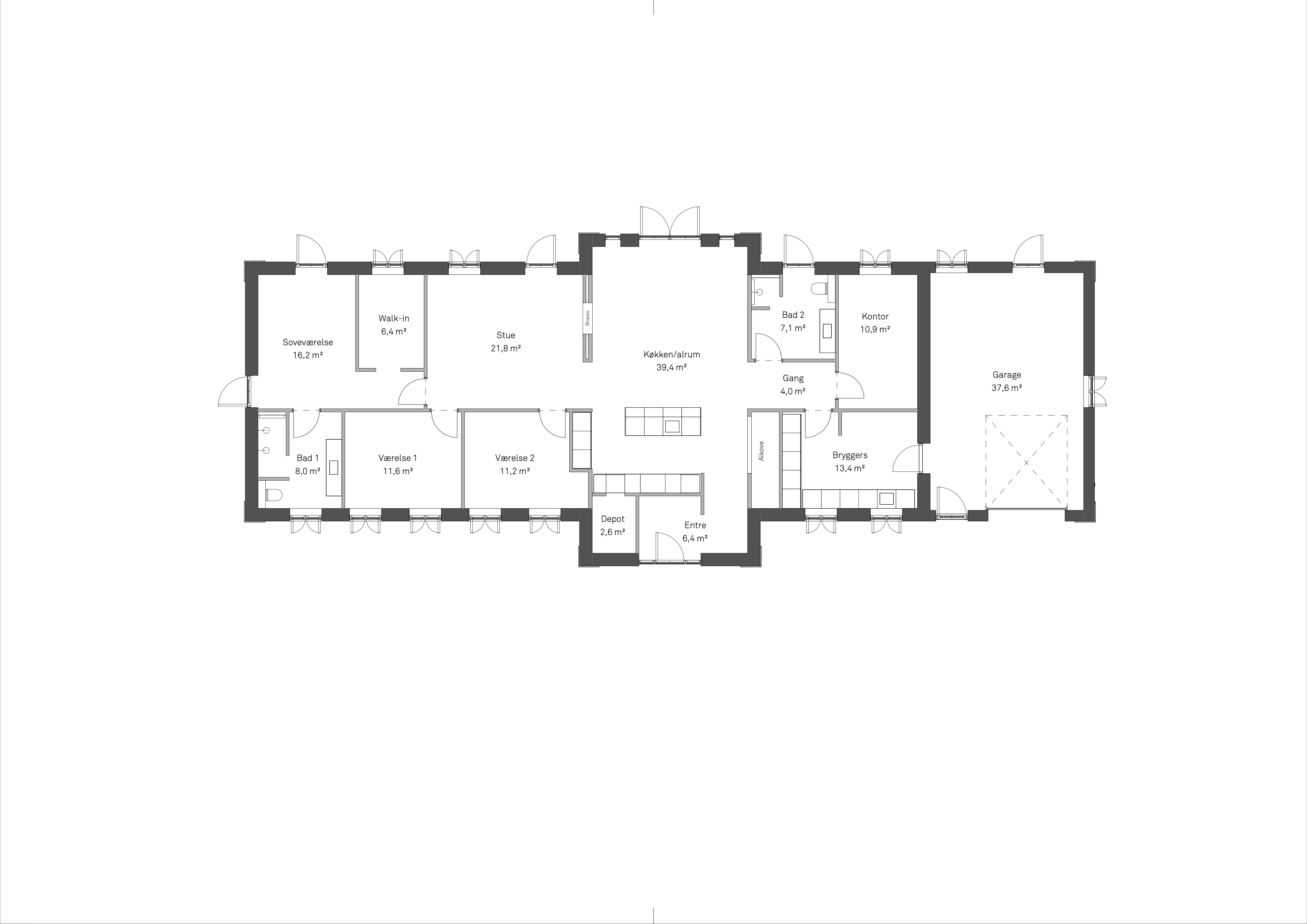Husets midterste del hæver sig elegant over de to længer og skaber en naturlig rummelighed, der mærkes allerede i entréen. Her løfter loftet sig højt op og giver et generøst førstehåndsindtryk. Lige bag entréen åbner hjemmet sig op og byder indenfor i husets hjerterum, køkken-alrum og spisestue. Til venstre for køkkenet er der blevet plads til en dyb alkove, hvor de to små børn kan lege, mens madlavningen er i fuld gang.