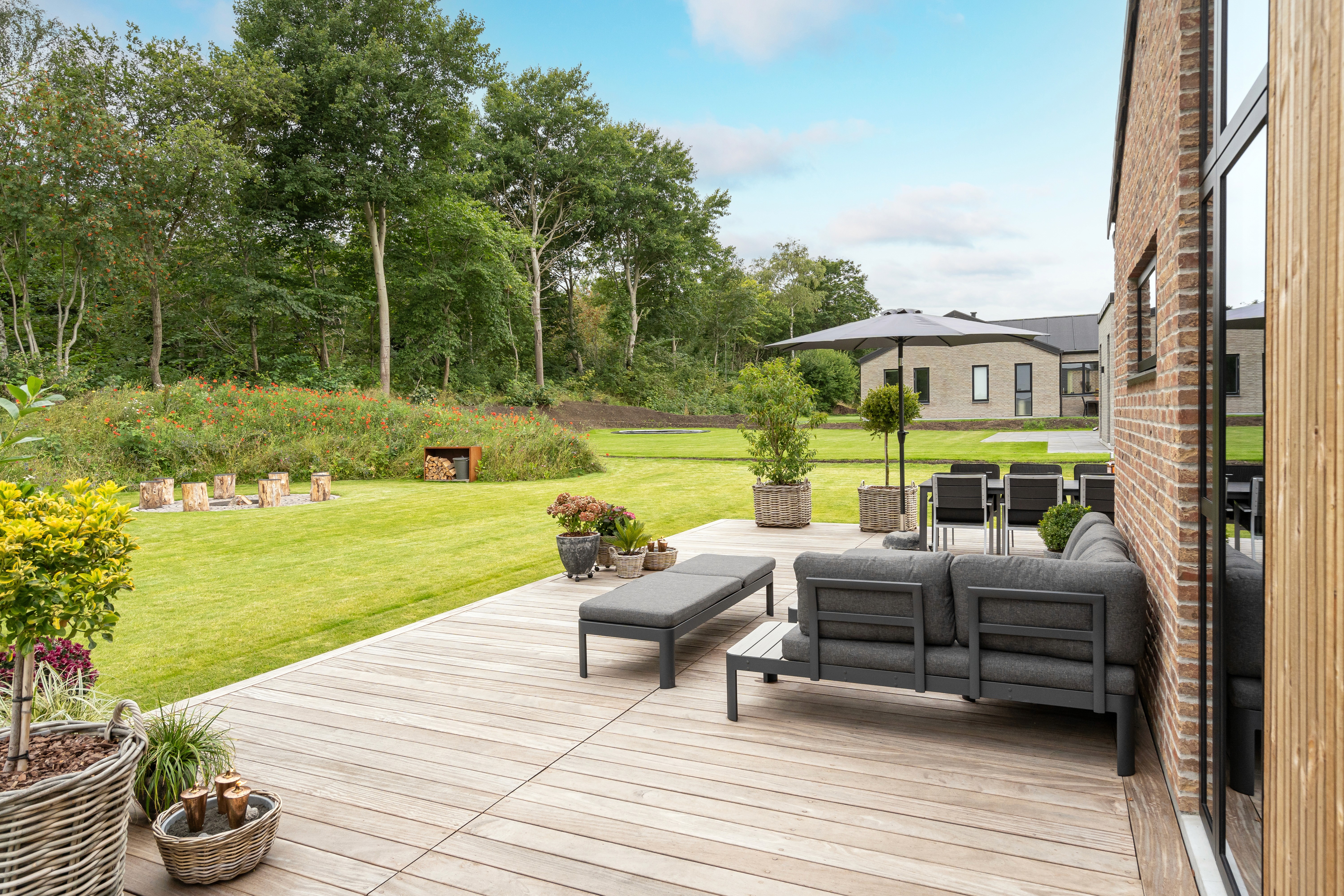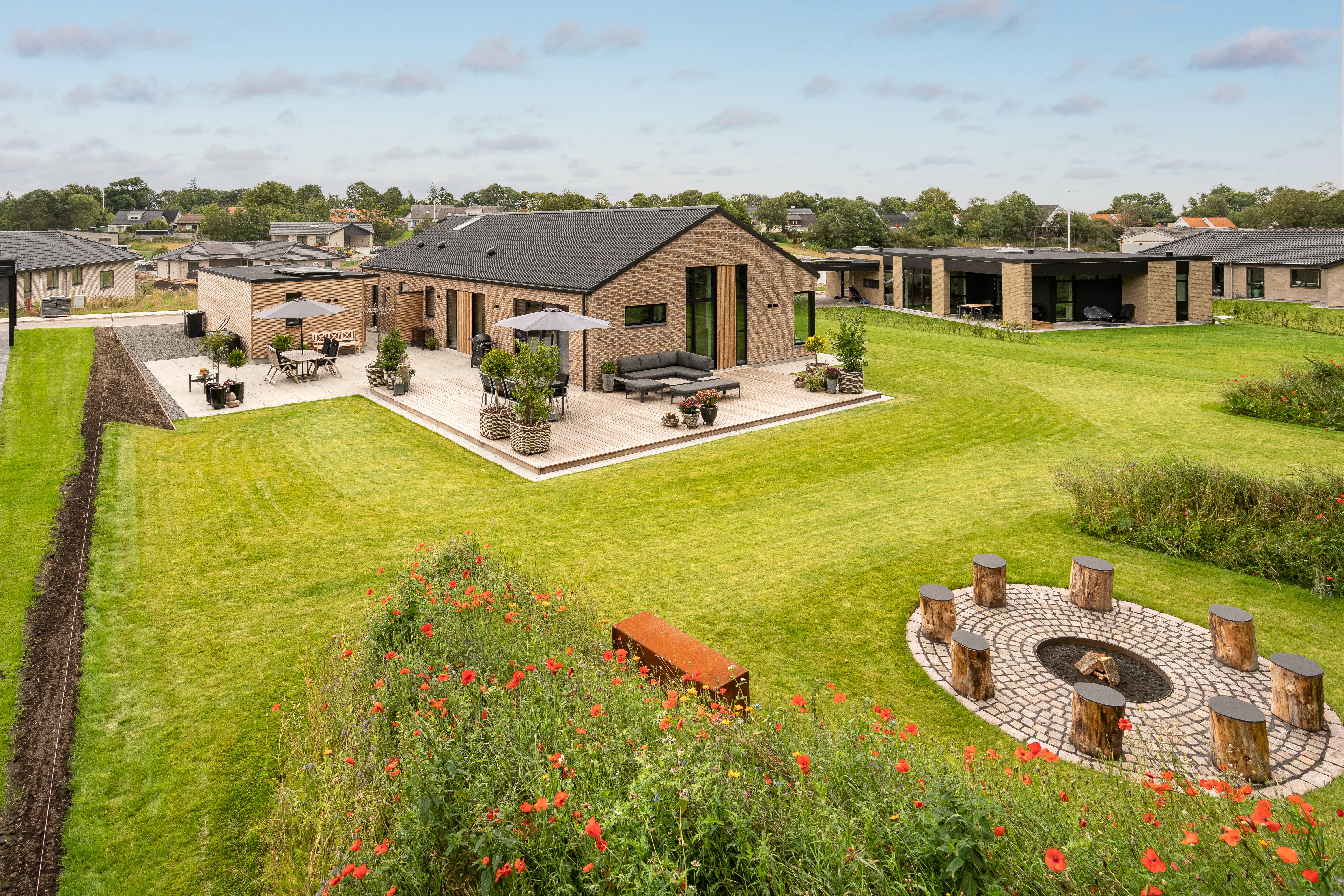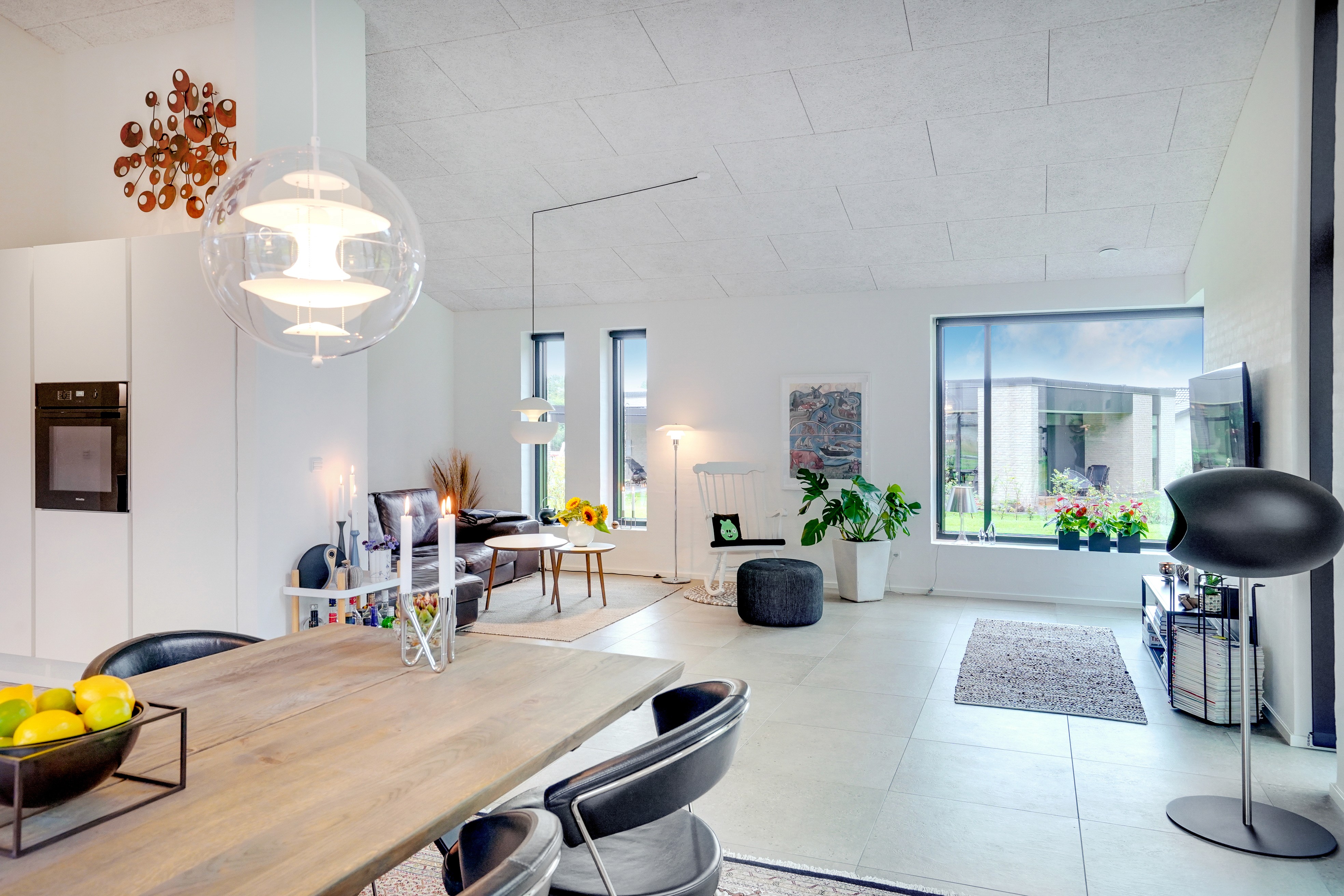 Stuen er placeret i åben forbindelse med spisepladsen, men sofaen har fået sit eget indhak, hvilket skaber en hyggelig zone afskærmet fra køkkenet. Hjørnevinduet og de sorte vinduesrammer indrammer udsigten. Familien har gjort ekstra meget ud af haven, hvor der både er udebruser og bålplads at finde.