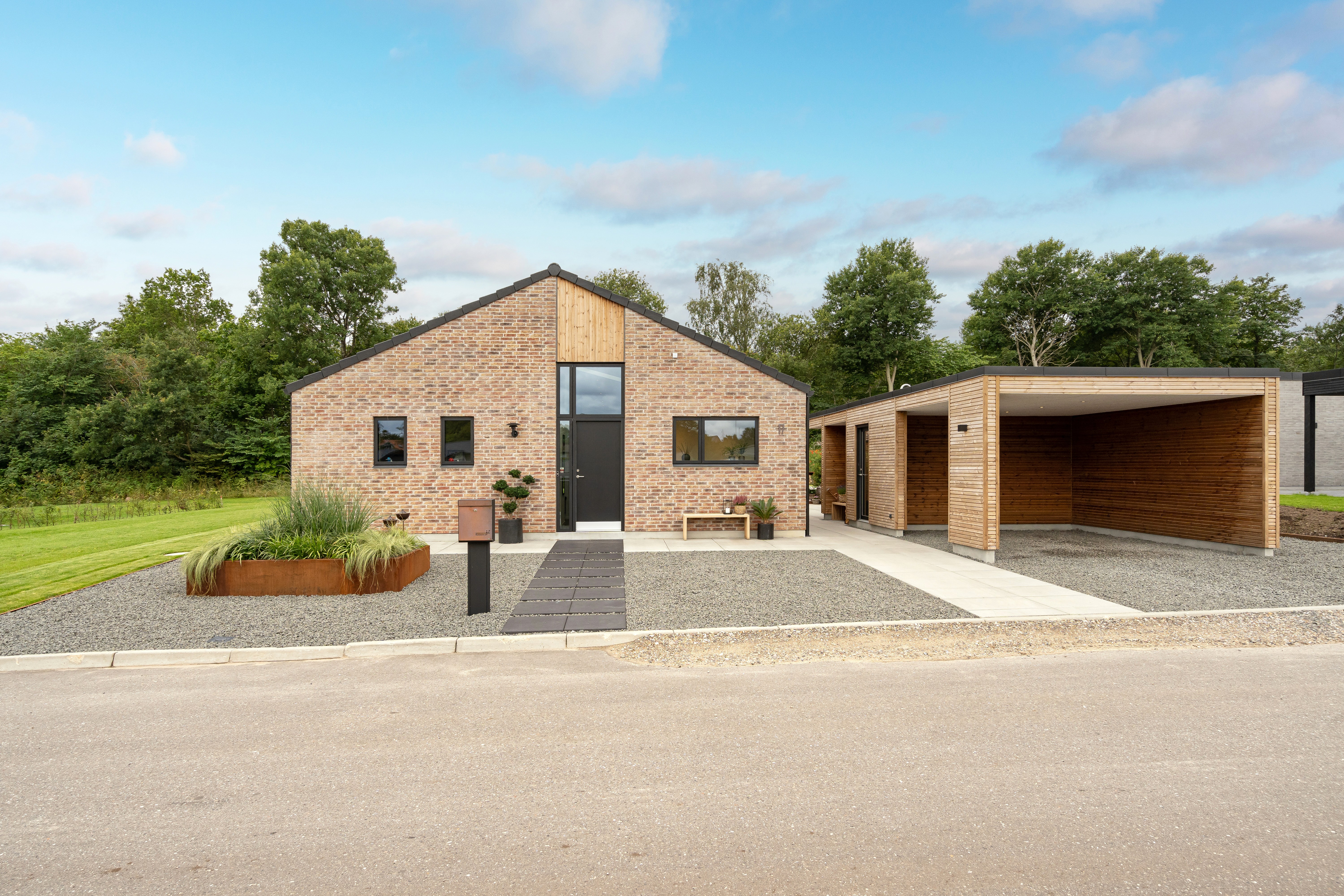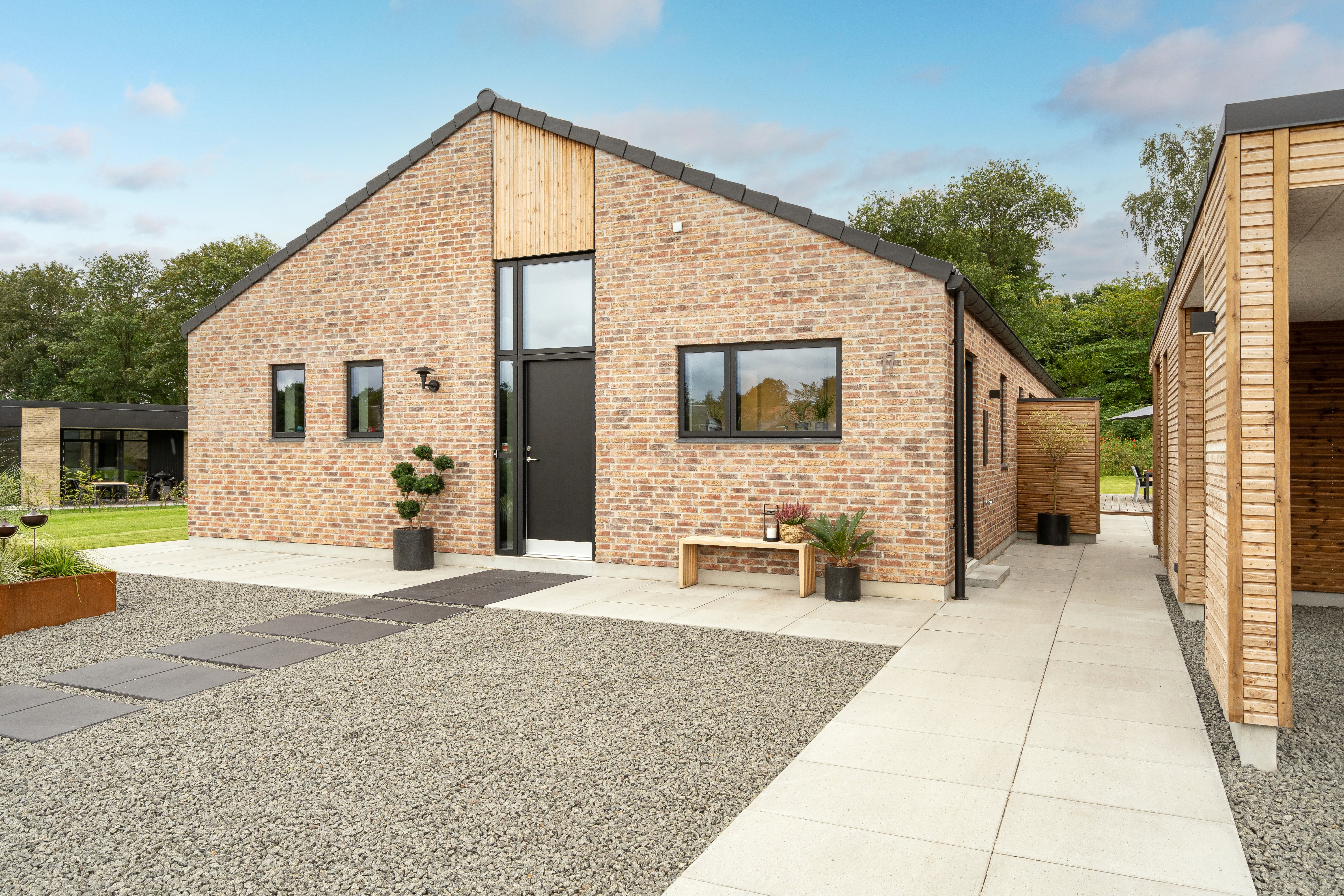 I denne månedens hus er landskabet og de store træer i baghaven tænkt med ind i designet af boligen. Retro-arkitekturen er opbygget som et bredt længehus med sadeltag uden udhæng, hvilket giver et strømlinet arkitektonisk udtryk. Felterne med træ bryder de store murstensflader og giver huset et varmere islæt.