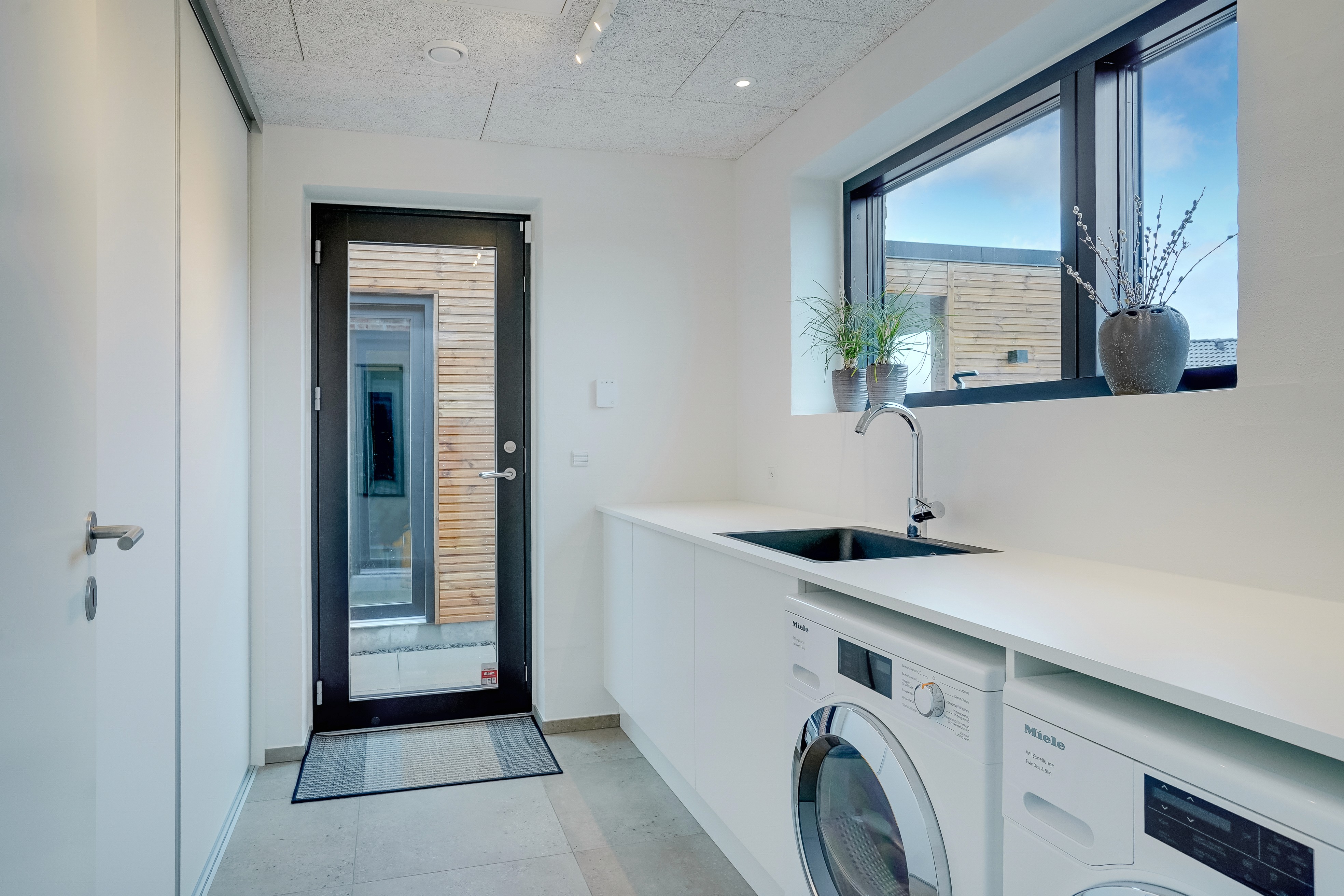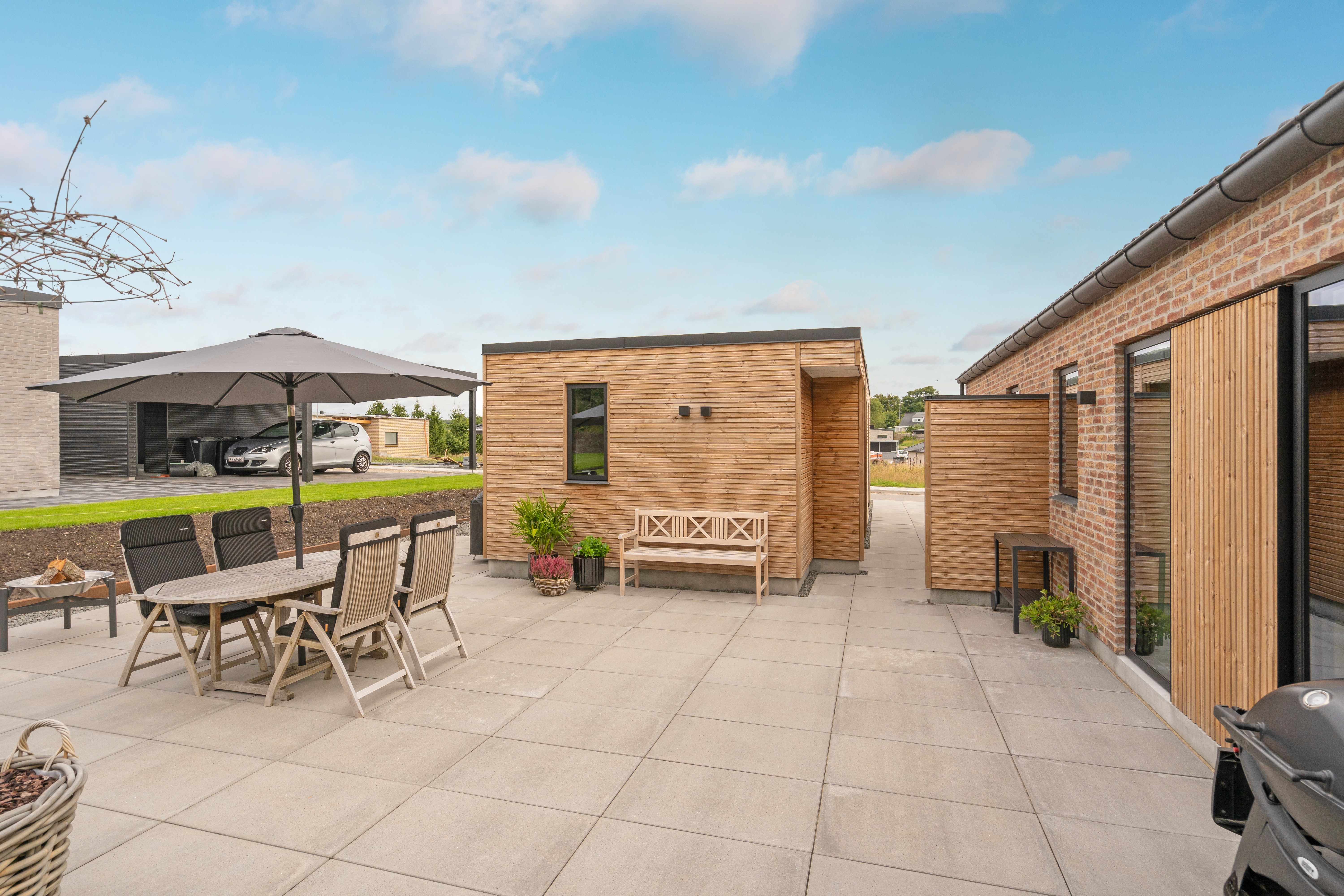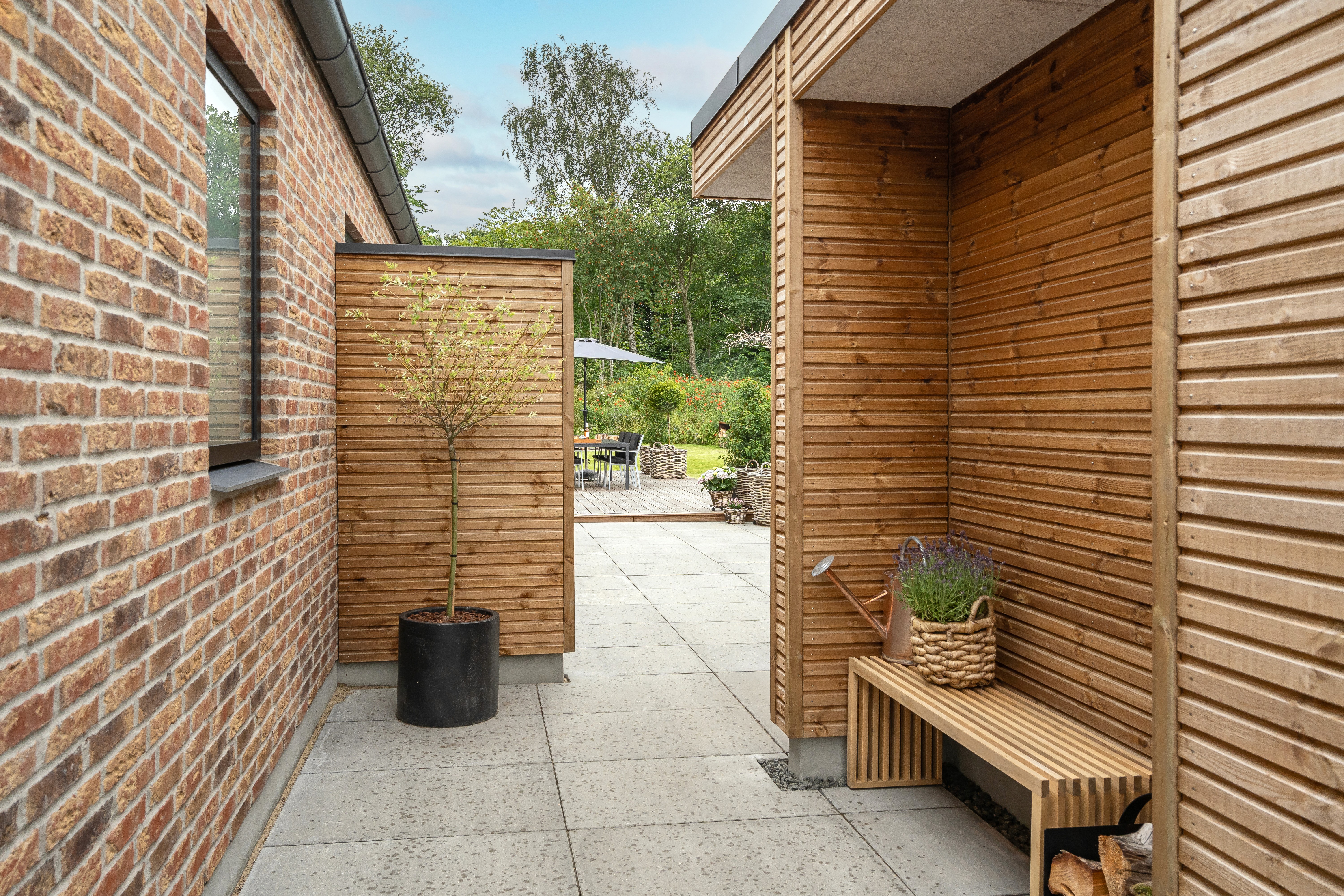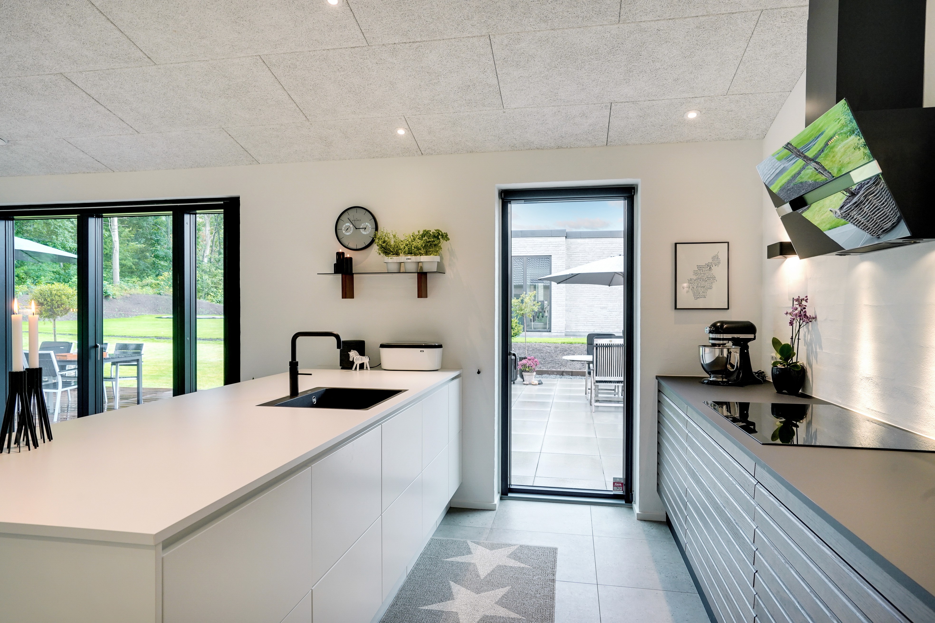 I stedet har de prioriteret kvadratmeterne i husets primære leverum, køkken-alrummet. Her er loft til kip, og det er her familien tilbringer det meste af sin tid. Det store vinduesparti til gulv i endegavlen giver frit udsyn til den frodige have, der udfolder sig lige udenfor. Fra køkkenet er der på den ene side adgang til forældreafdeling med soveværelse og badeværelse, mens en stor og lækker træterrasse, inddelt i flere zoner udfolder, sig til den anden side.