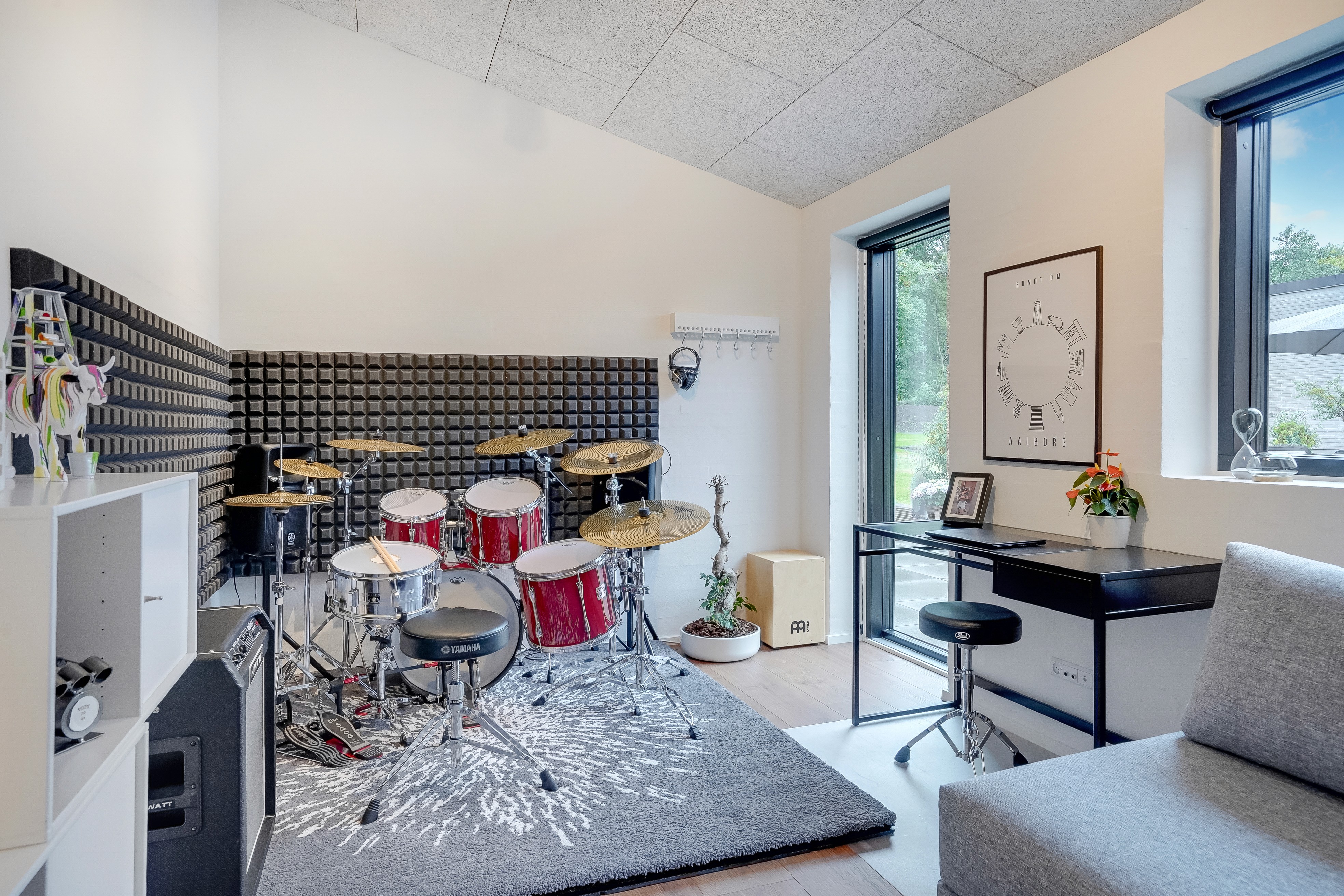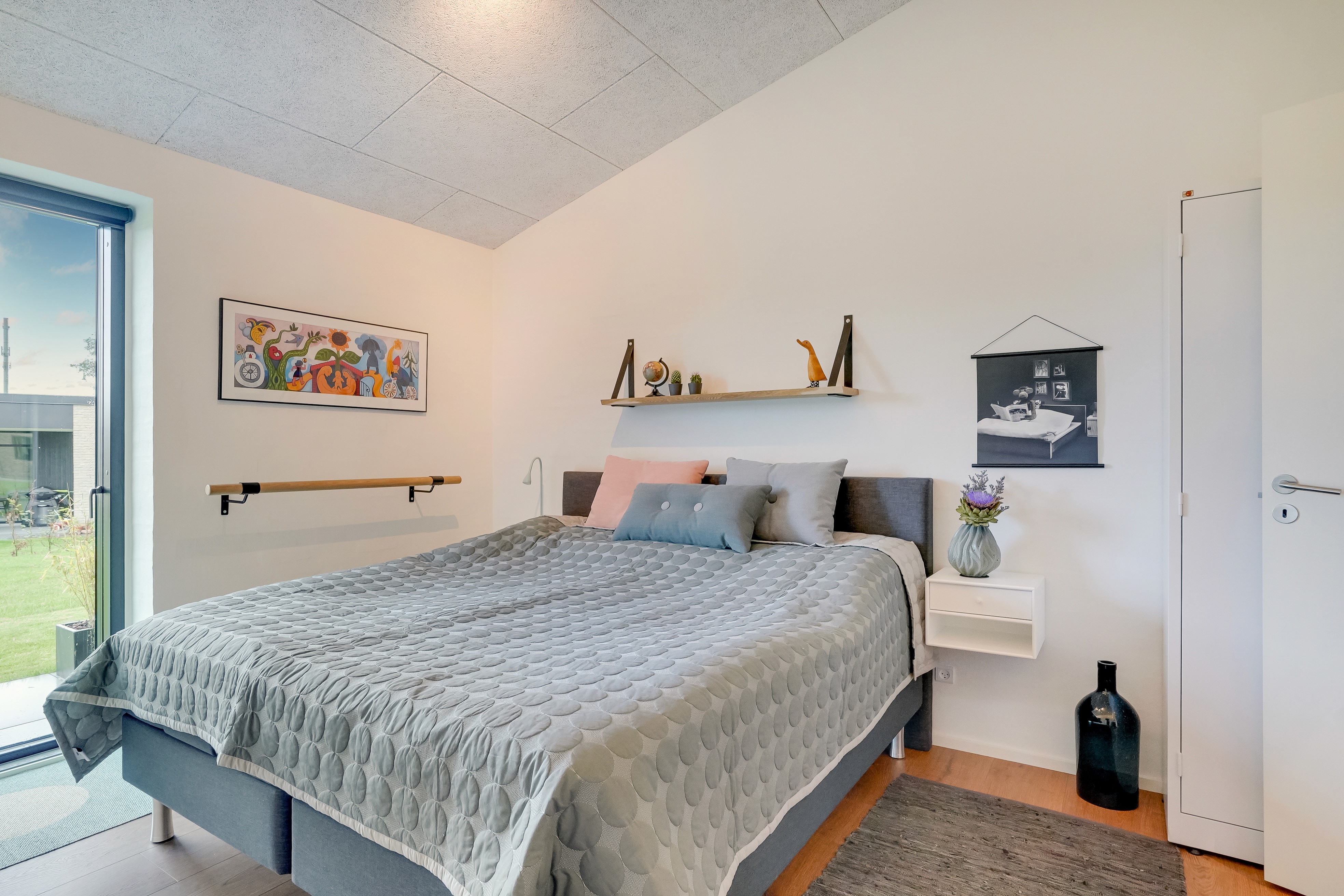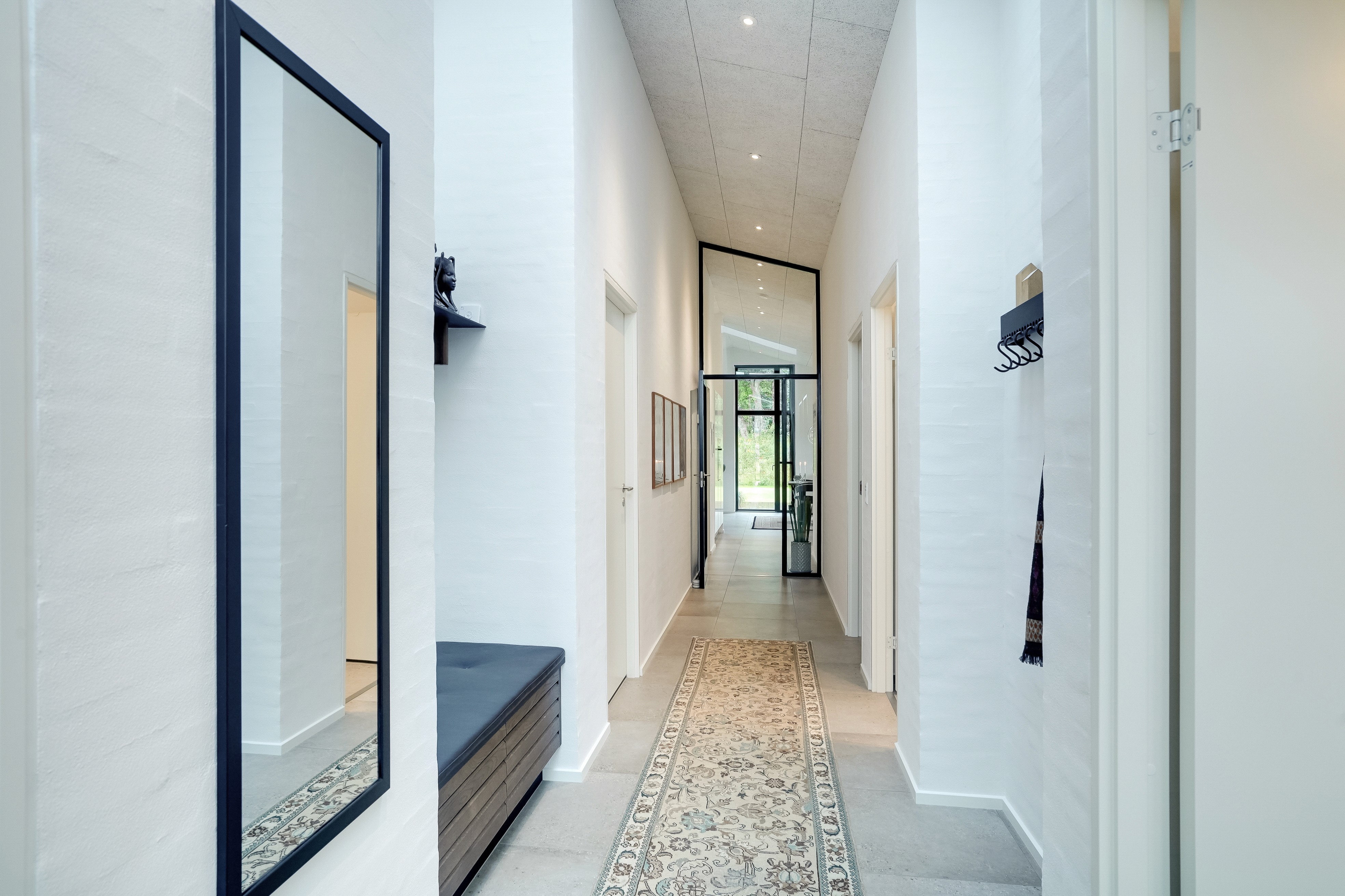 Når du træder indenfor i husets entré, får du en fornemmelse af rummelighed og her opleves den gode loftshøjde. En integreret garderobeløsning er at finde samt adgang til et teenage-værelse og et gæsteværelse samt badeværelse. Familien har kun et hjemmeboende barn, så de har bygget huset til deres behov på byggetidspunktet.