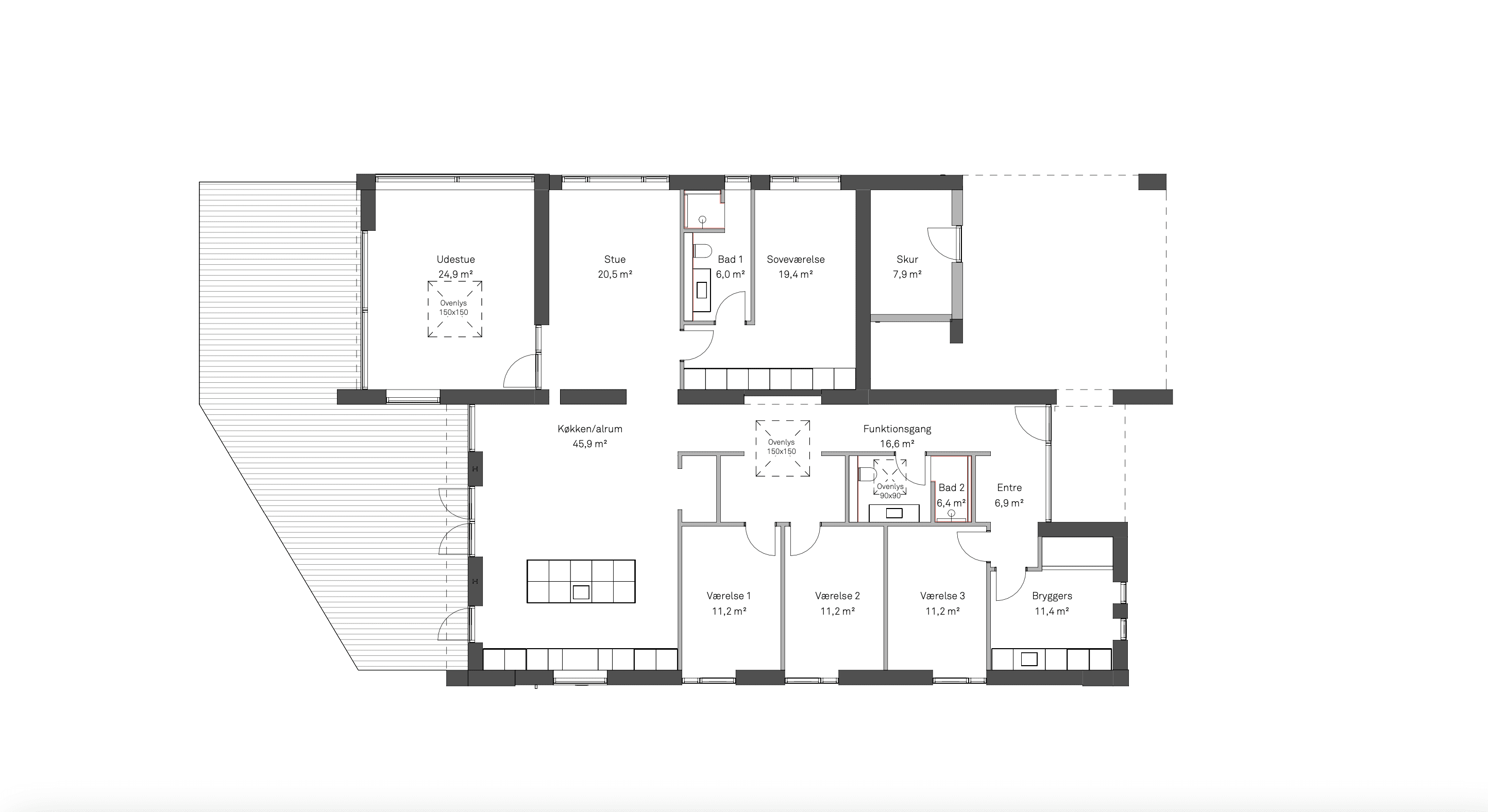 Huset består af 201 m² veldisponeret bolig udført med høj finish og gennemtænkte løsninger. Hertil kommer en stor lækker udestue som emmer af æstetik og hygge. Huset er udført i en smuk kombination af træ og lyse mursten med sort tag, sort alu-beklædning og sorte vinduer. Husets gennemgående ryg giver bygningskroppen et interessant, helstøbt og anderledes udtryk.