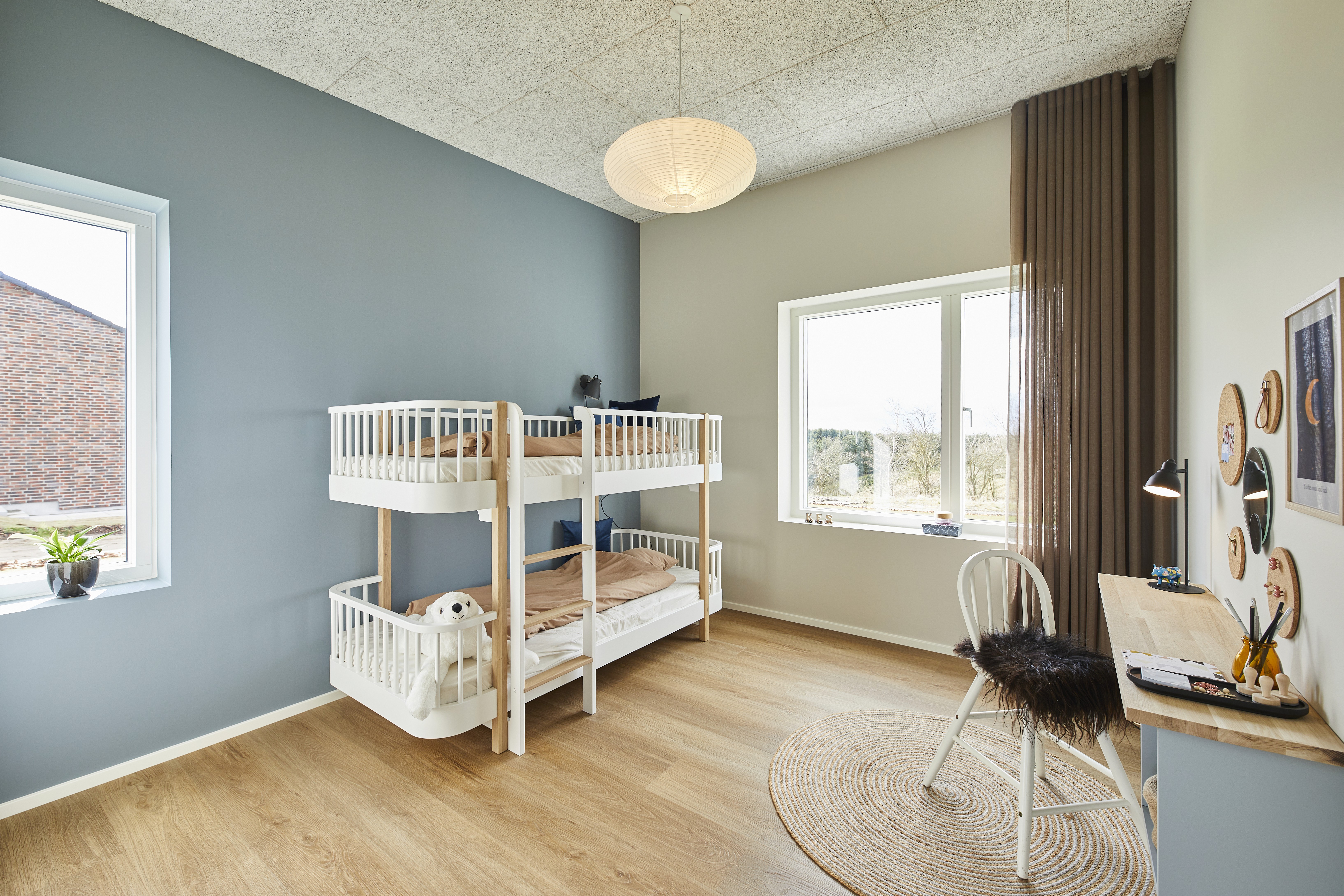 Mange vil gerne understrege forskellen på pige- og drengeværelset med en farve, især i børnenes yngre år – her vælges der ofte en sart lyserød eller lyseblå. Annette giver modsat et bud på, hvordan man kan finde to farver, som ikke kun kan bruges mens børnene er 0-3 år, men som har en længere levetid, og som samtidig passer ind i resten af hjemmets farvepalet. Annette foreslår, at man vælger dybere farver, som er let støvede i deres udtryk. Det kan stadig være en blå og en lyserød, men blot i en lidt anden udgave. Igen foreslår hun, at man maler en enkelt væg i rummet.