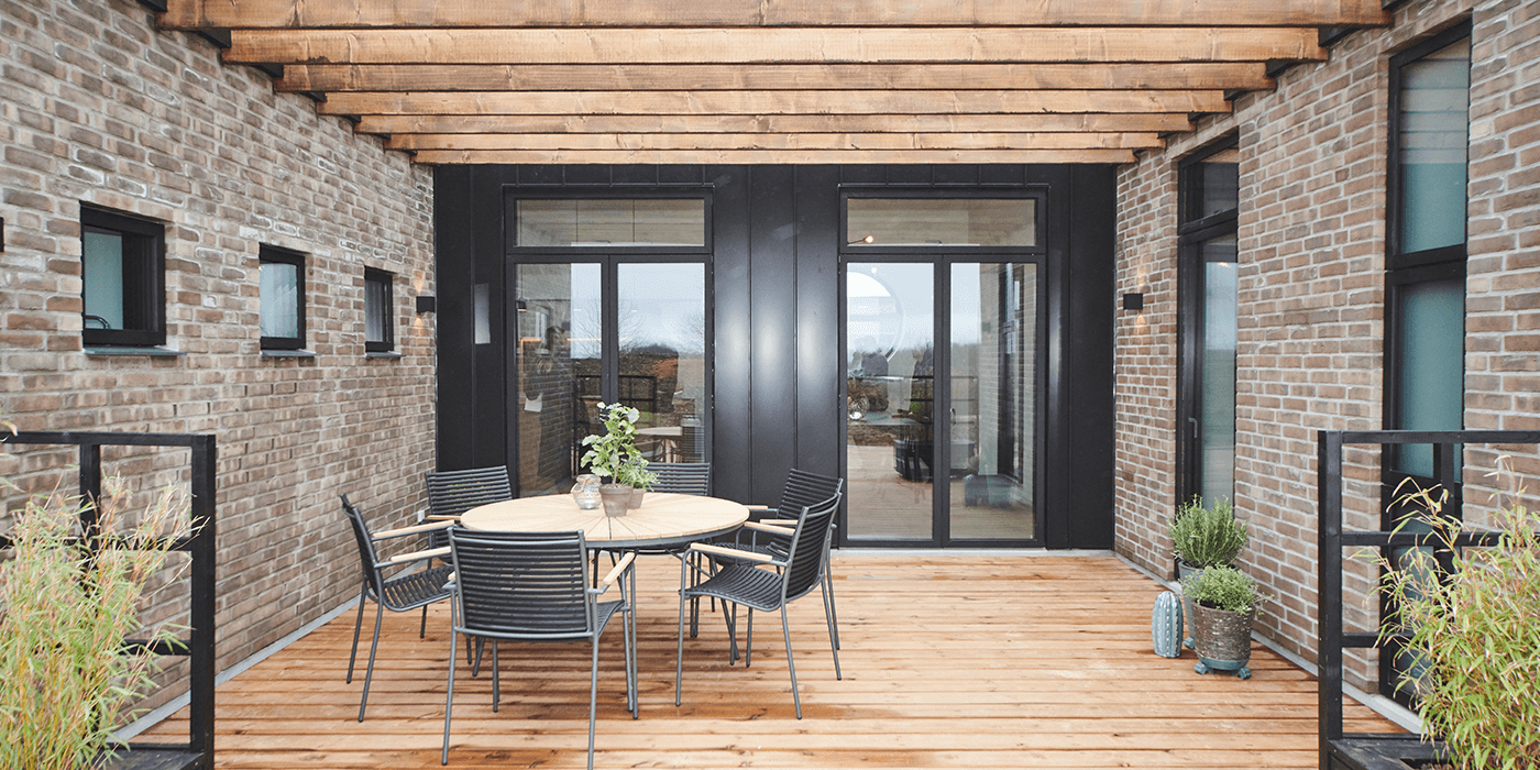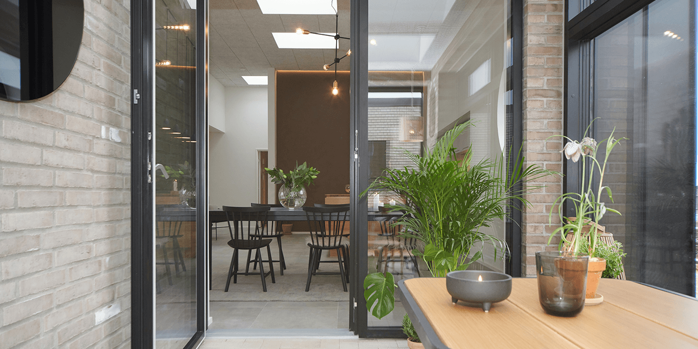 Nu er vi kommet dertil i udviklingen, hvor vi tænker hyggelige terrassemiljøer ind, gerne på flere sider af boligen, og grønne områder såvel ude som inde. Vi trækker tråde fra 70’erne, hvor vi blandt andet tør eksperimentere med mørke farver. I stedet for pang-farver, som var tilfældet omkring år 2010, vælges nu de dusede farver, som giver et roligt udtryk.